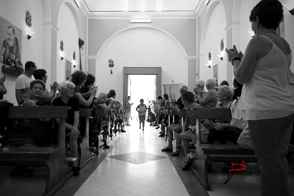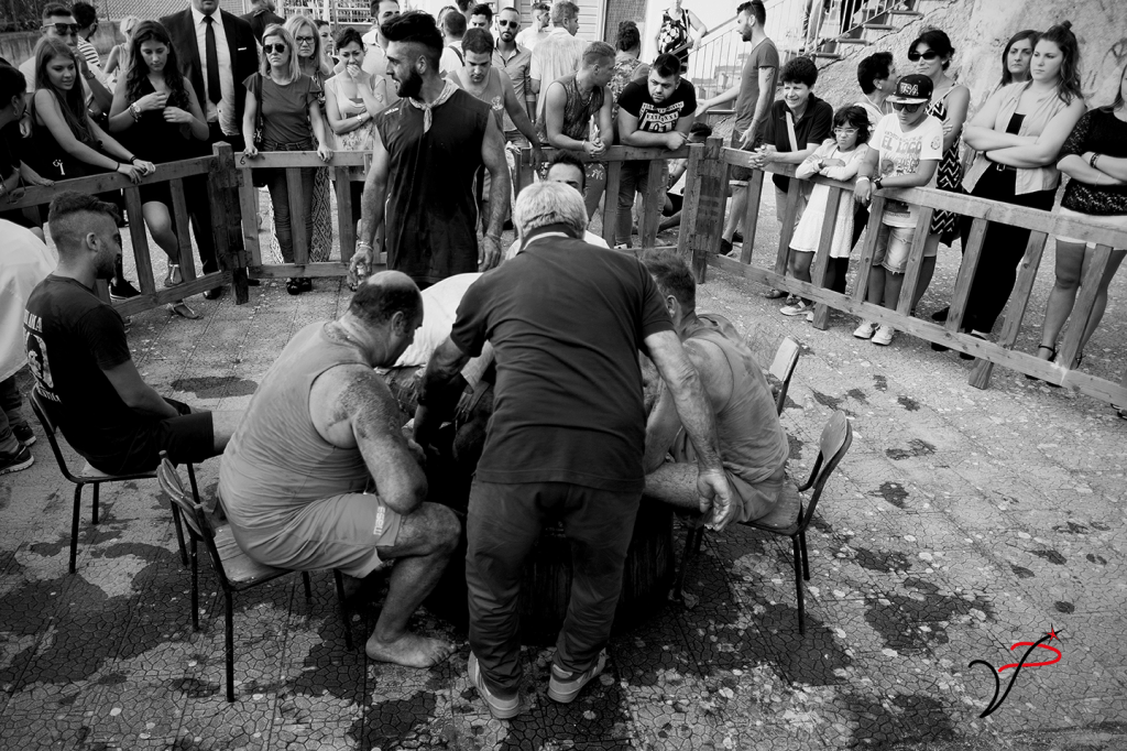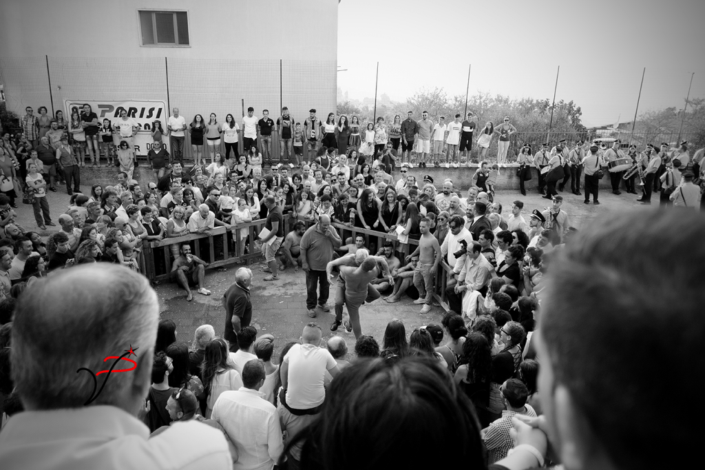 Lo stato intermedio tra sacro e profano è quello della prova, dei corpi in agone per il bene quotidiano il giorno di festa. I maschi di Salvitelle (SA) dimostrano la propria resistenza al santo martire, alla propria comunità, agli “stranieri” correndo, scalzi, partendo dal monte più alto del paese, a baciare la statua di San Sebastiano custodita in cappella e lottando, alla maniera dei greci e dei romani, dopo aver disinfettato le ferite nel vino. Il tempo della corsa, il tempo del saluto al santo, il tempo della lotta, il tempo che divide il sacro e il profano è veloce ed eterno.